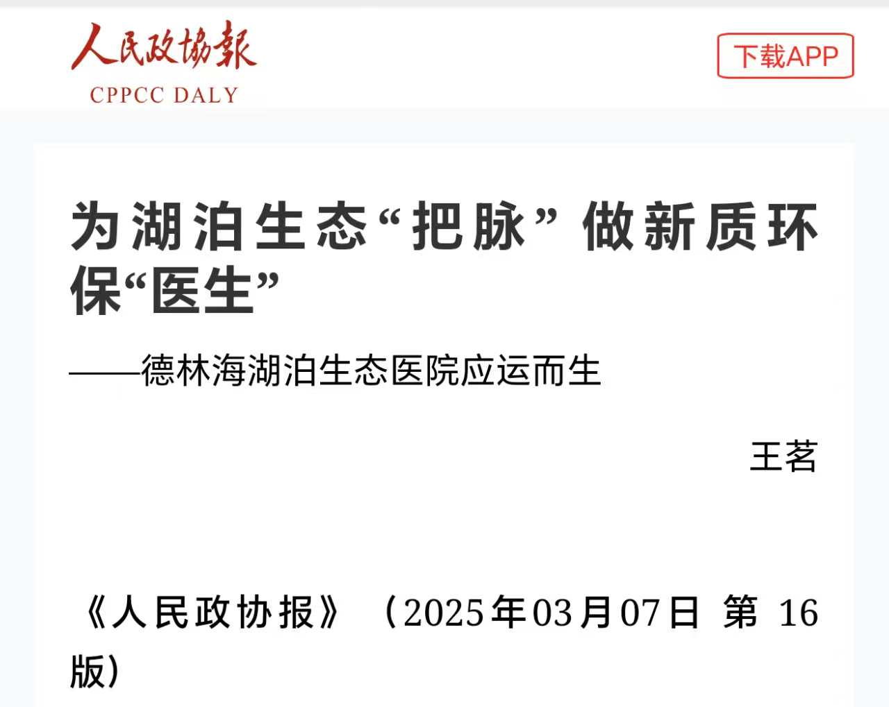 2025年3月7日,人民政協(xié)報發(fā)表文章《為湖泊生態(tài)“把脈” 做新質(zhì)環(huán)?!搬t(yī)生”——德林海湖泊生態(tài)醫(yī)院應(yīng)運(yùn)而生》,文中對德林海湖泊生態(tài)醫(yī)院自主研發(fā)的加壓控藻技術(shù)、中宇宙數(shù)字孿生診驗系統(tǒng)和精準(zhǔn)清淤技術(shù)等主流藍(lán)藻治理和湖庫富營養(yǎng)化內(nèi)源治理技術(shù)以及湖庫保護(hù)治理創(chuàng)新模式——績效付費(fèi)模式進(jìn)行了詳細(xì)報道,并盛贊以“善水者 善于水”為發(fā)展理念的德林海湖泊生態(tài)醫(yī)院是新質(zhì)環(huán)保企業(yè)代表。